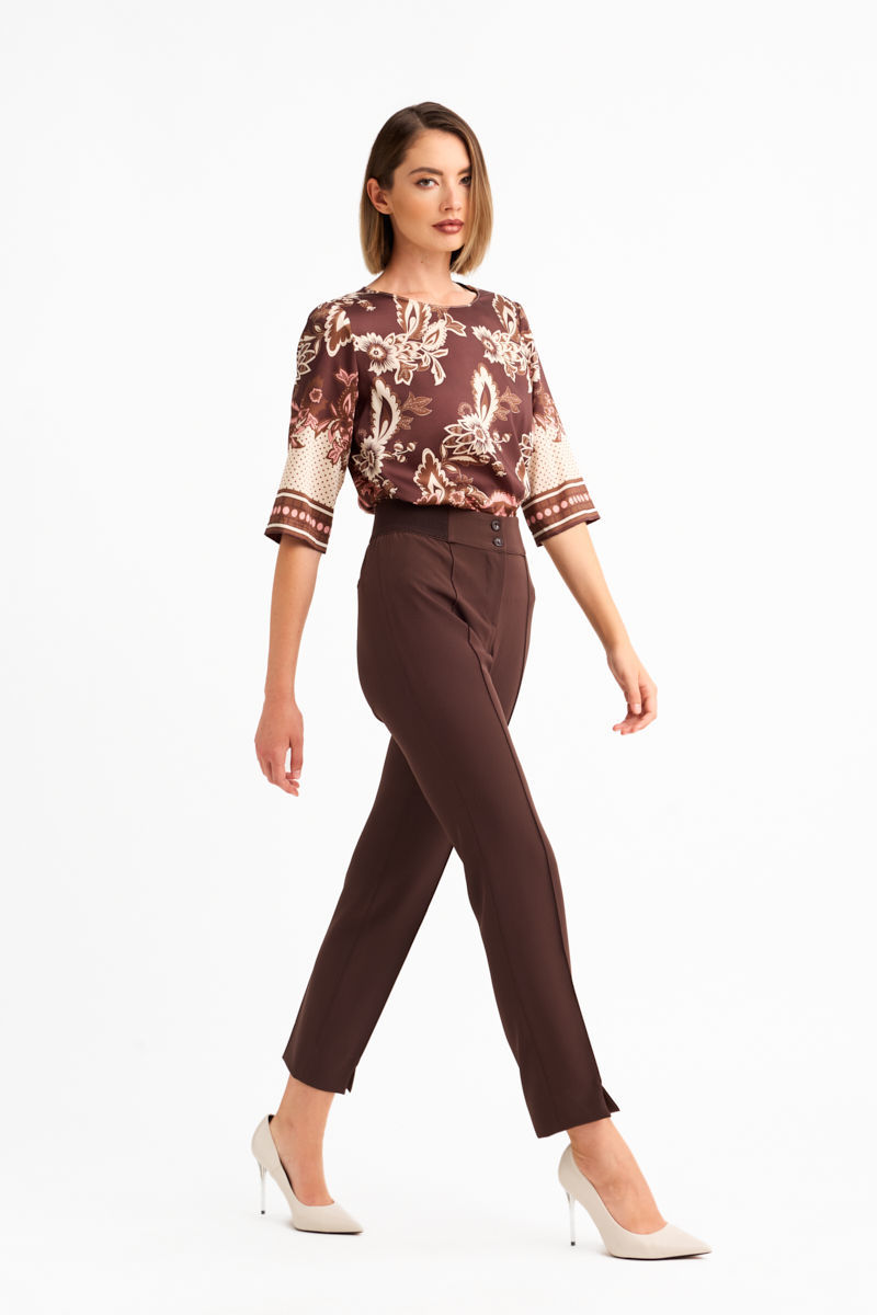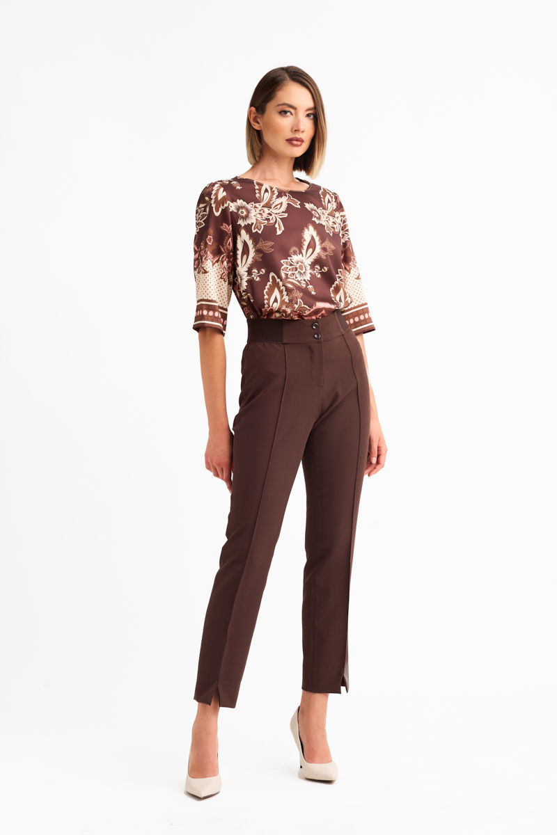 Κομψό παντελόνι σε κρεπ ελαστικό ύφασμα που προσφέρει άψογη εφαρμογή και άνεση. Διαθέτει φαρδύ λάστιχο στη μέση, στο ίδιο χρώμα, που αγκαλιάζει διακριτικά τη σιλουέτα και εξασφαλίζει τέλεια εφαρμογή. Το νερβίρ γαζί στο κέντρο προσδίδει μια εκλεπτυσμένη γραμμή, ενώ το μικρό άνοιγμα στο τελείωμα χαρίζει μοντέρνο χαρακτήρα. Ιδανικό για επαγγελματικά ή κομψά καθημερινά looks — συνδυάζεται άψογα με το σακάκι της συλλογής για ένα ολοκληρωμένο σύνολο με διαχρονική φινέτσα.